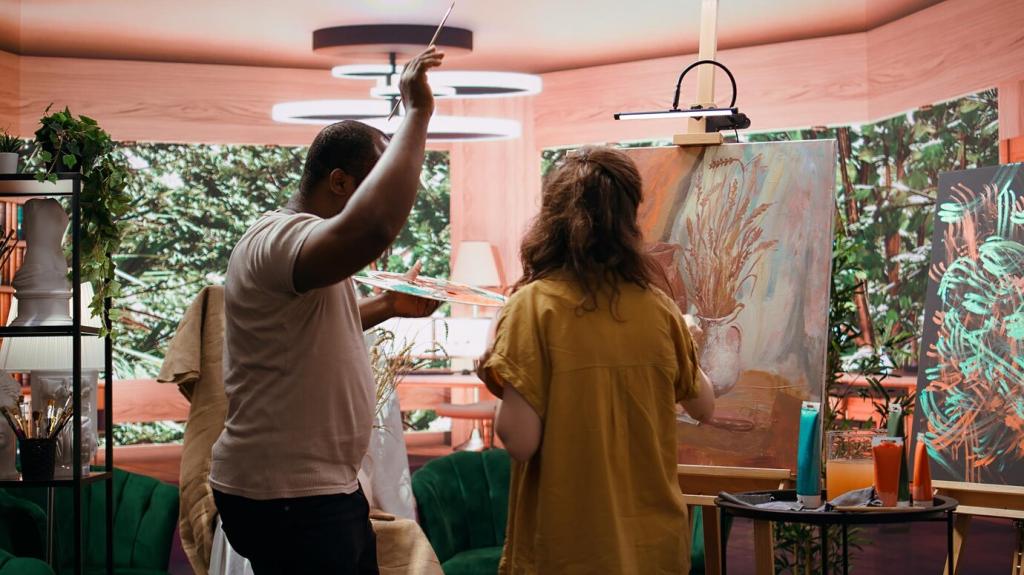 Warme Töne treten vor, kühle treten zurück. Ein warmes Ocker im Vordergrund ließ ein kühles Blau wie Abendluft erscheinen. Wechseln Sie gezielt Temperaturen, um Ebenen aufzubauen, Wege anzudeuten und Stimmungen subtil, aber kraftvoll zu modulieren.